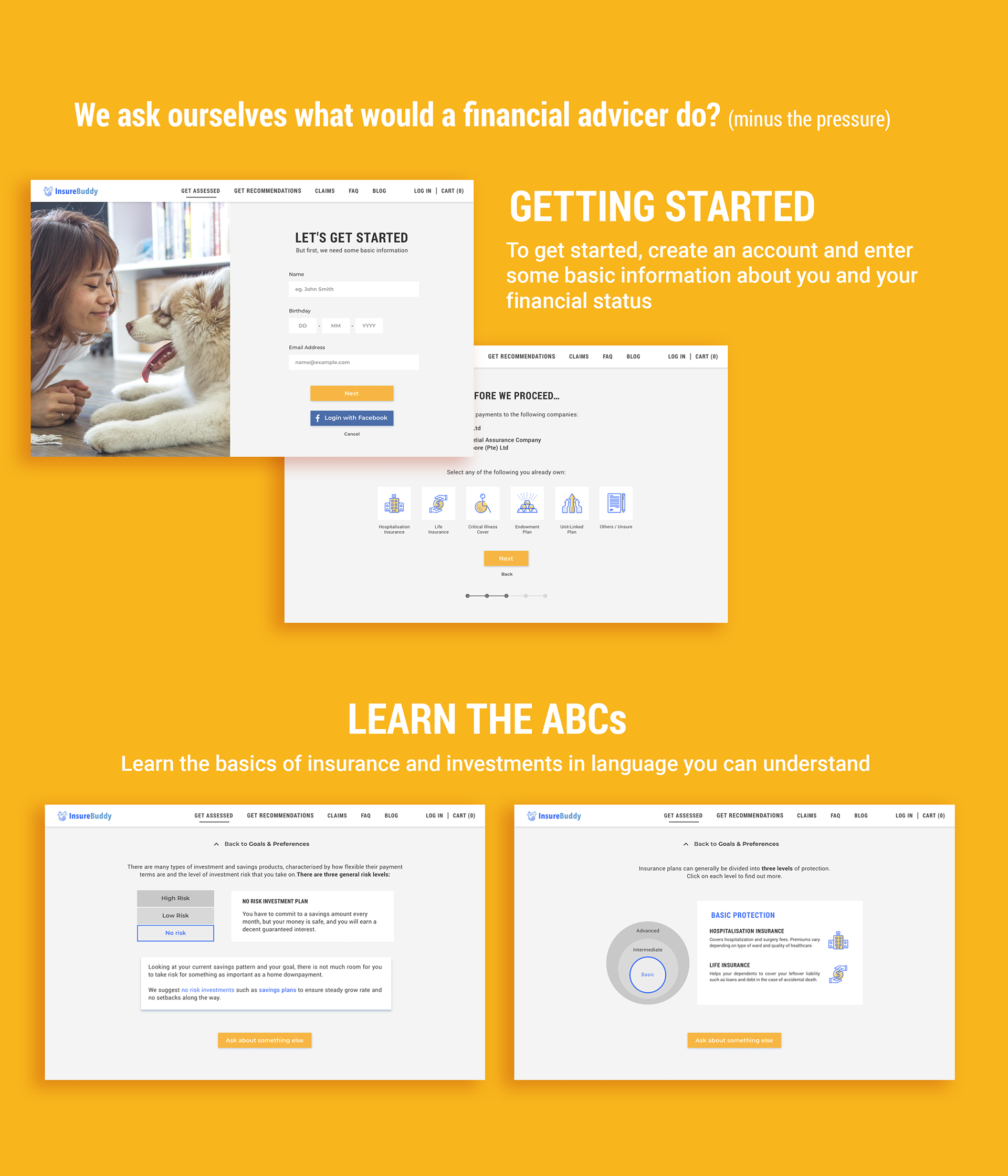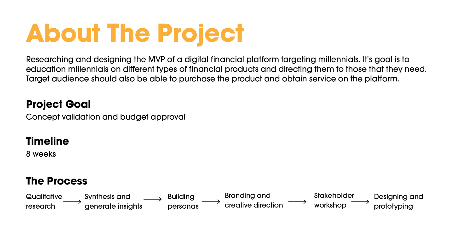 Researching and designing the POC of a self-serve digital financial platform targeting millennials. It's goal is to help millennials gain financial awareness and recommending them the right product in the absence of an financial advisor
